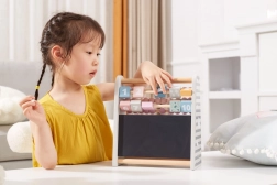 Gekleurde kralen en omklapblokjes met cijfers motiveren kinderen om de basis van wiskunde op een natuurlijke en speelse manier te ontdekken.