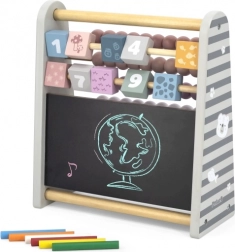 Dit multifunctionele houten 3-in-1 telraam verenigt leren en spelen. Met de gekleurde kralen oefenen kinderen het tellen, met de omklapblokjes met cijfers leren ze cijfers herkennen en eenvoudige relaties, en op het krijtbord kunnen ze hun eerste sommen en tekeningen schrijven of tekenen.