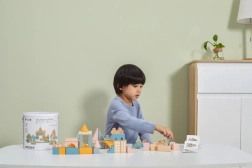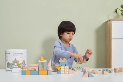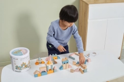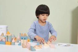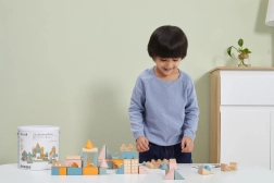 De gevarieerde vormen en afmetingen (ca. 2,5–9 cm) laten kinderen huizen, torens en een hele stad bouwen en oefenen het ruimtelijk inzicht.