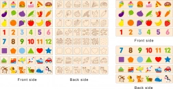 Kinderen plaatsen houten stukjes in de juiste openingen op basis van de afbeeldingen op de plank. Ze oefenen logica, aandacht en fijne motoriek bij elk spel.