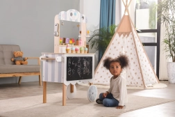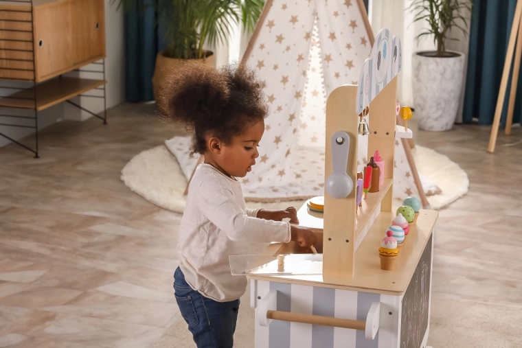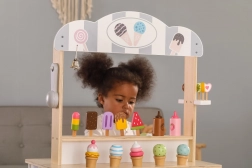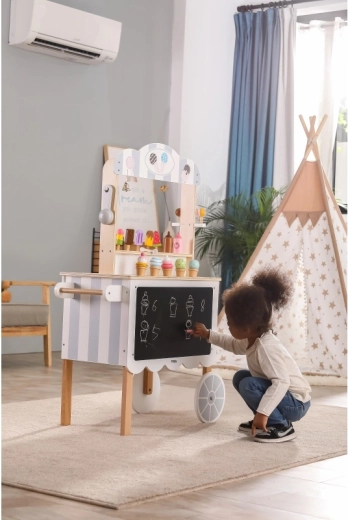 Deze houten kraamset werkt als winkel, banketbakkerij of ijsstalletje. Kinderen kunnen hun favoriete scenario naspelen met behulp van verschillende accessoires zoals lollies, ijsjes, wafels en toppings. Een geweldig onderdeel is het bord om het menu van de dag op te schrijven of te tekenen. De hele set is geverfd met niet-giftige verf in zachte kleuren die de aandacht van kinderen trekken.