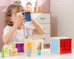 De transparante kunststof wanden van de blokken voegen een extra dimensie toe aan het spel, omdat ze licht reflecteren en kinderen laten zien hoe het beeld van de wereld om hen heen verandert. Dit opent de deur naar creativiteit en het observeren van licht en kleuren.