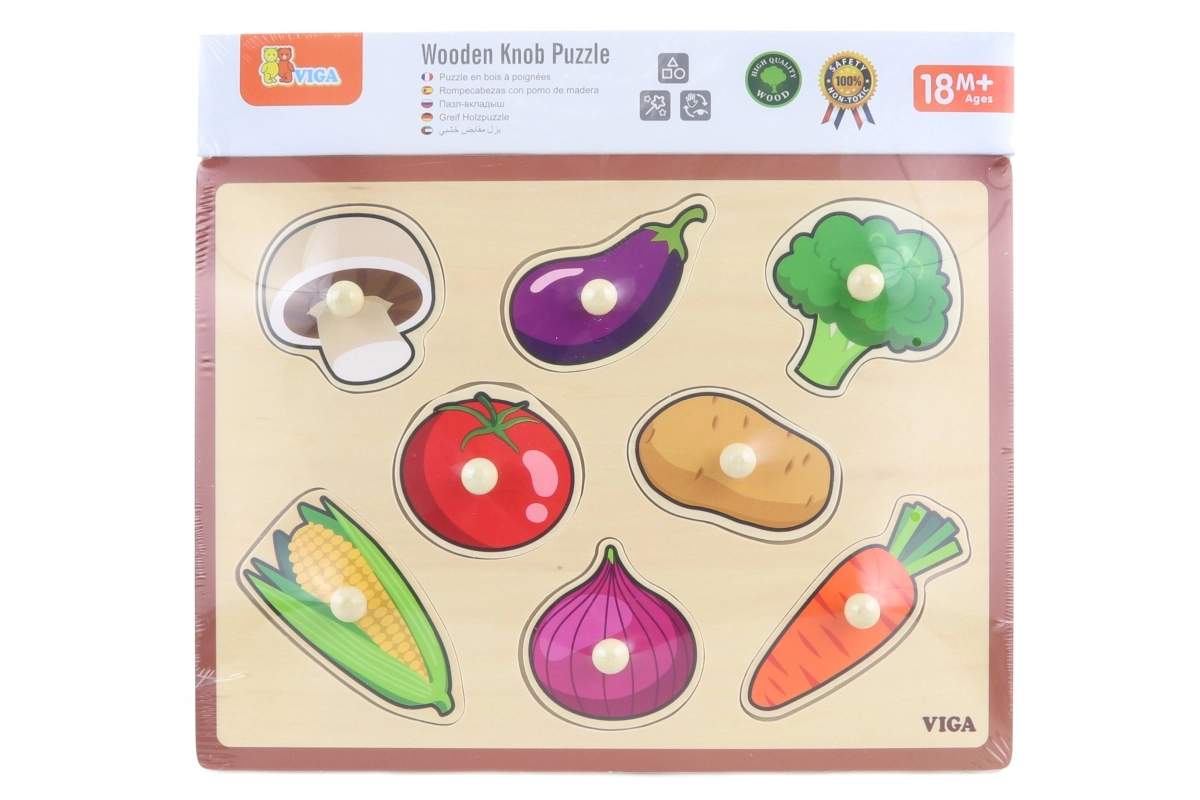 De houten groente-inlegpuzzel is een uitstekende keuze als eerste educatief speelgoed. Kinderen leren op een leuke manier vormen, kleuren en verschillende groentesoorten herkennen. De stevige houten plaat met uitsparingen en de glad afgewerkte stukjes zijn aangepast aan kleine kinderhanden.