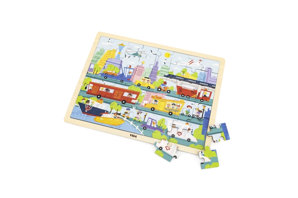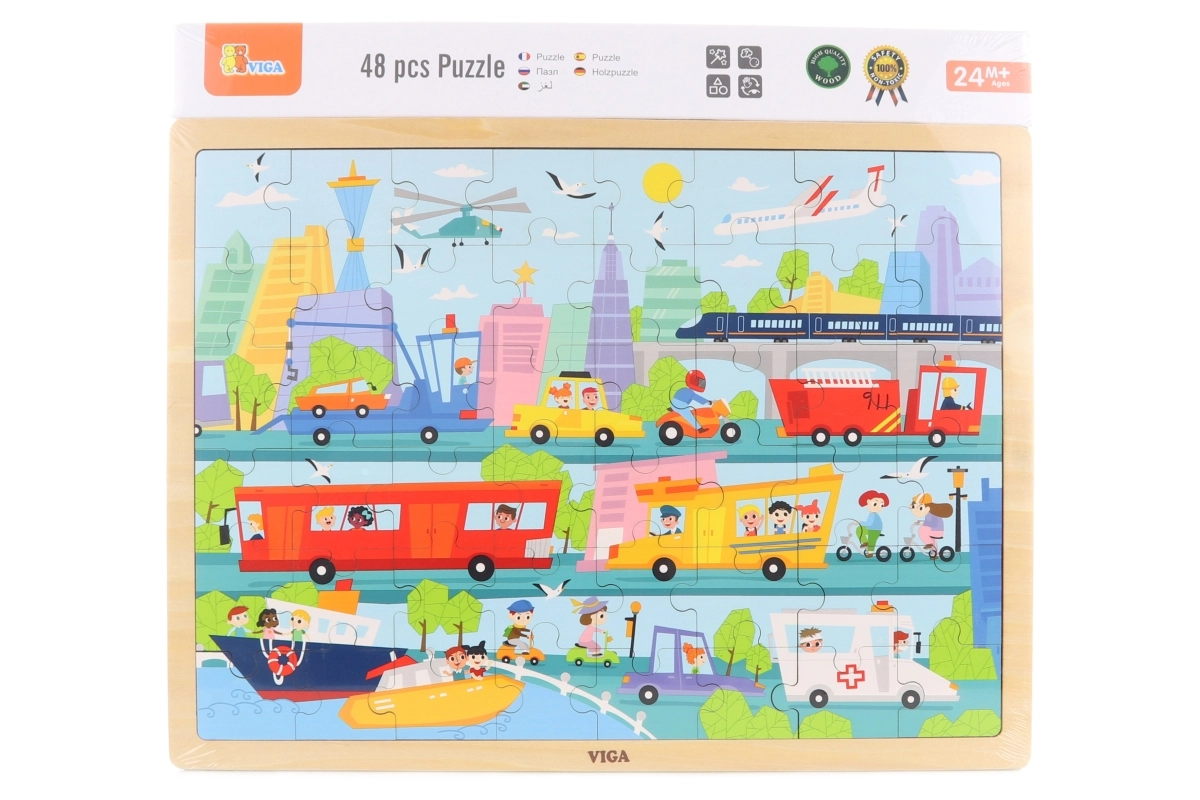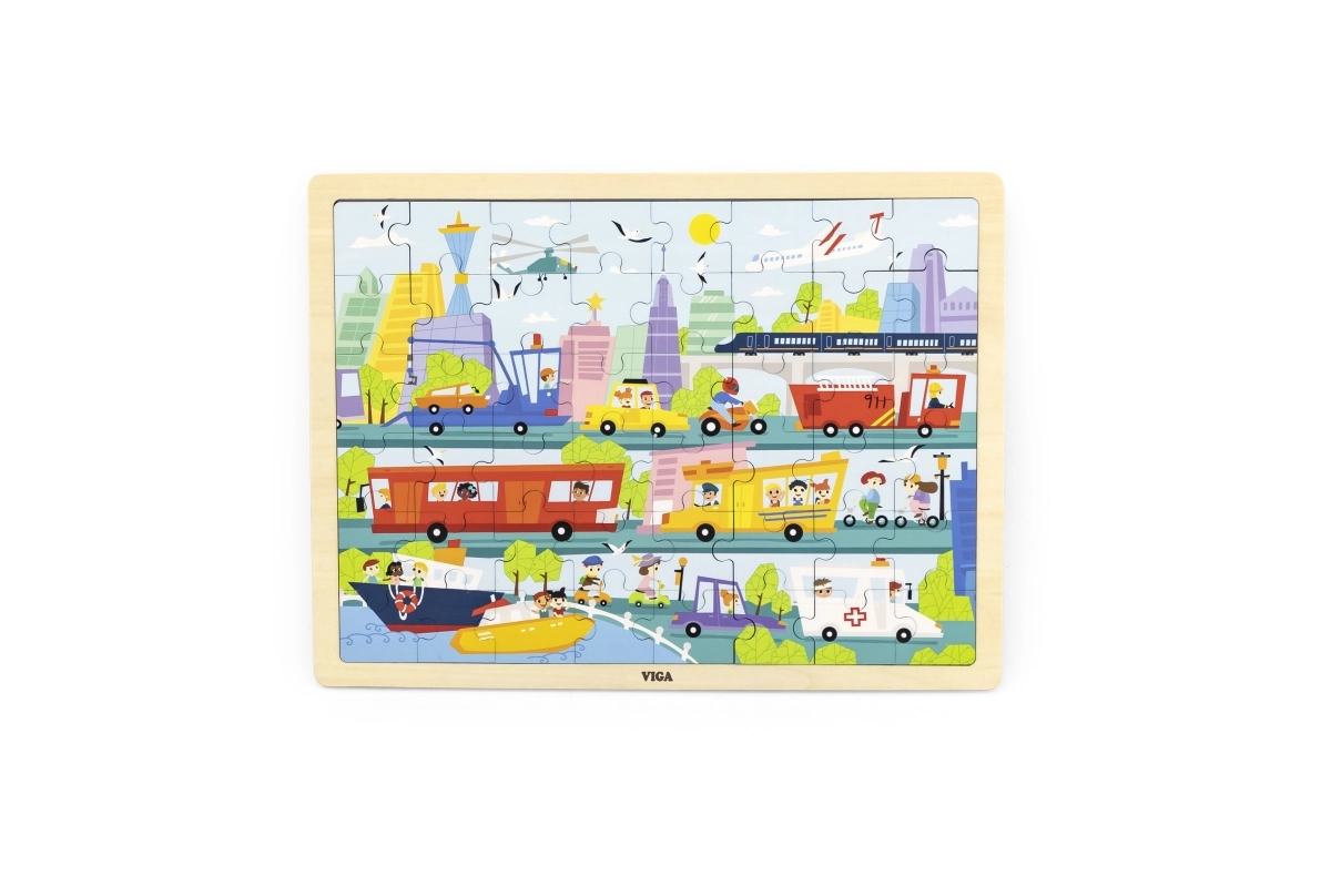 Deze kwaliteitsvolle houten puzzel met een kleurrijke stadsscène en vervoersmiddelen zal kleine ontdekkers enthousiasmeren. Dankzij de 48 stukjes en het stevige frame oefenen kinderen hun concentratie, oog-handcoördinatie en geduld. Heldere kleuren en duidelijke illustraties moedigen aan tot herhaald puzzelen.
