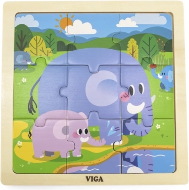 Schattige houten puzzel met olifanten voor kleine bouwers vanaf 18 maanden. 9 stukjes op een stevige houten plaat van 22 × 22 × 1 cm stimuleert de fijne motoriek, coördinatie en eerste logisch denken.