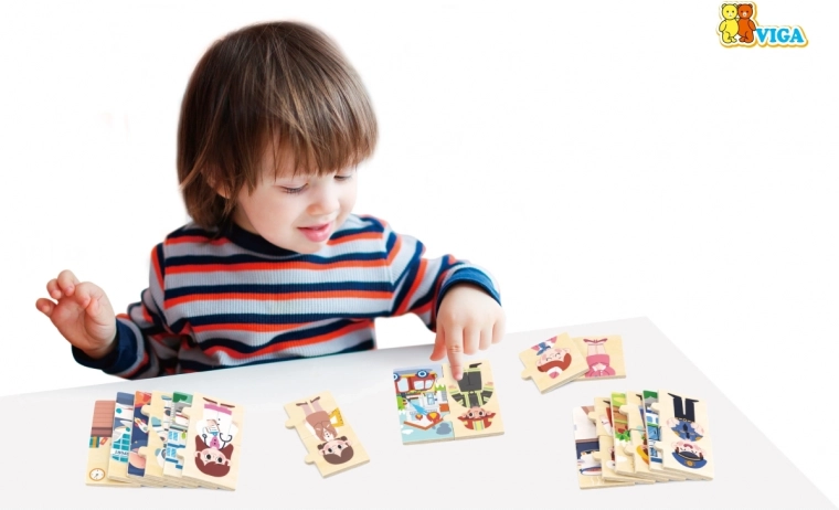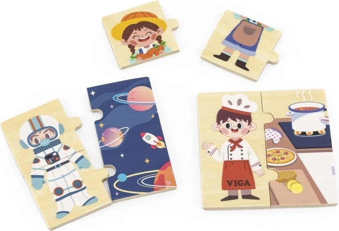 Het didactische houten spel van VIGA laat kinderen op een speelse manier kennismaken met verschillende beroepen – van arts en brandweerman tot kok of astronaut. Elk beroep bestaat uit drie delen: twee voor het personage en één groter voor de werkplek. Kinderen koppelen eerst het juiste duo en verbinden dit vervolgens met de omgeving.