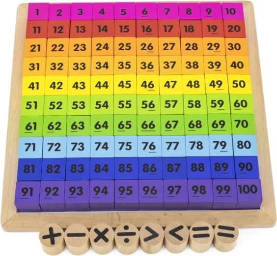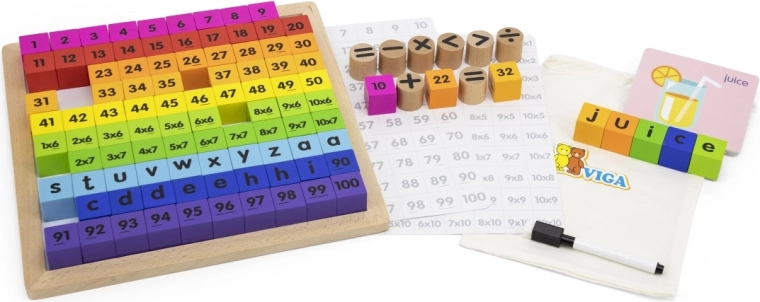 Elk houten blokje is aan vier zijden bedrukt – hoofd- en kleine letters, getallen tot 100, vermenigvuldigingen en uitkomsten – zodat kinderen de alfabet, tellen, spelling en rekenkunde kunnen oefenen. Alles is opgeborgen in een elegant houten dienblad en aangevuld met een praktische katoenen tas, waardoor de set ook perfect is als cadeau.