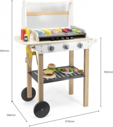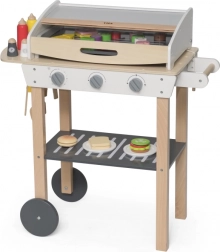 De VIGA kindergrill biedt een authentieke grillervaring in een veilige, hoogwaardige en stabiele houten constructie. Kinderen kunnen spiesen, burgers, hotdogs of sandwiches bereiden en “gasten” bedienen alsof het een echte tuinparty is. Draaiknoppen met klikeffect, een afneembare deksel en een uitschuifbaar rooster ondersteunen realistisch spel en de ontwikkeling van vaardigheid.