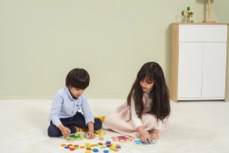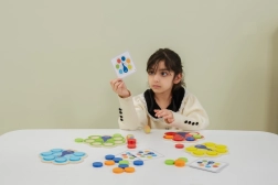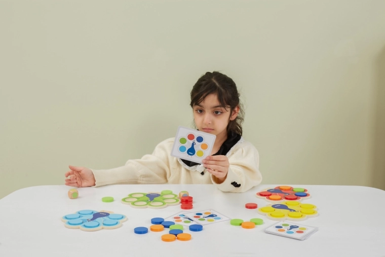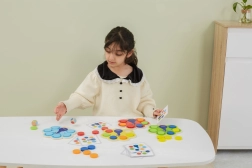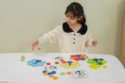 Kinderen plaatsen schijfjes volgens de kaarten of de dobbelsteenworp, waardoor ze op natuurlijke wijze kleuren aanleren en aandacht en logica trainen.