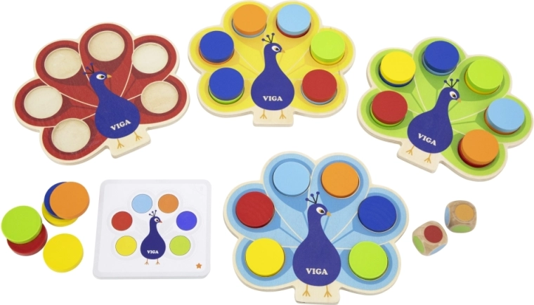 Het educatieve kinderspel VIGA Pauw leert kinderen op een speelse manier kleuren herkennen, en ontwikkelt fijne motoriek en oog-handcoördinatie. Gekleurde schijfjes worden in de staart van de pauw geplaatst volgens de kaarten of de worp met de kleuren dobbelsteen – ideaal voor Montessori leren, concentratie en samen spelen.