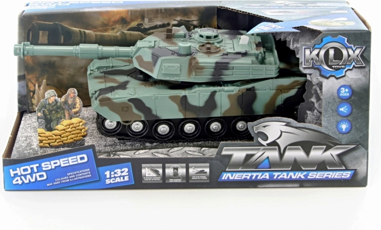 Leuke tank voor kinderen vanaf 3 jaar met donker camouflagemotief biedt schietgeluid, een oplichtend kanon en een draaibare loop in alle richtingen. De beweging wordt verzorgd door een vliegwiel, voeding 3× AG13 (batterijen zijn inbegrepen). Schaal 1:32, afmetingen ca. 22 × 8 cm.