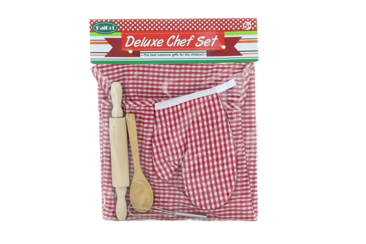 De set is ontworpen voor comfortabel gebruik door kinderhanden en stimuleert zelfstandigheid, verbeeldingskracht en een positieve relatie met eten en koken. Het schort en de ovenwant beschermen de kleding en geven het gevoel een echte chef-kok te zijn.