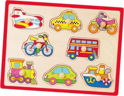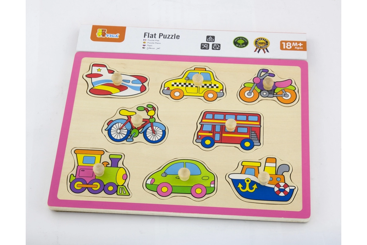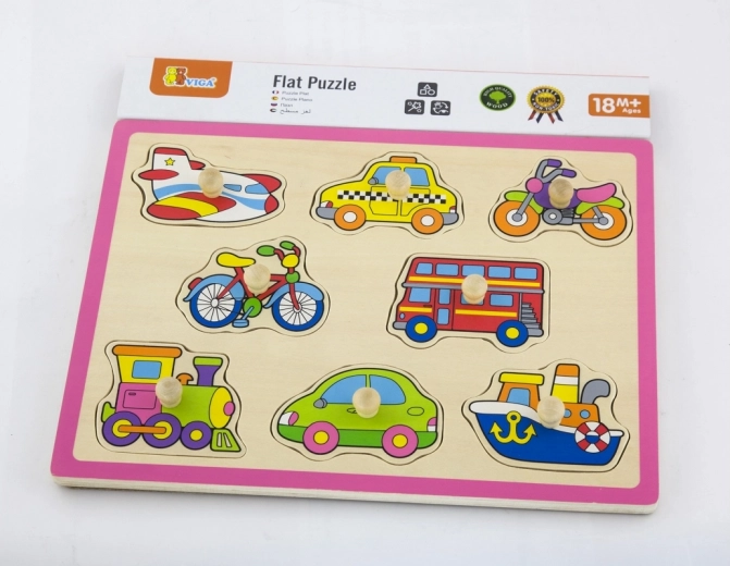 Deze hoogwaardige houten inlegpuzzel met voertuigen (vliegtuig, taxi, fiets, bus e.a.) biedt een speelse manier van leren. De stukjes met praktische knopjes passen in de voorgefreesde openingen, waardoor kinderen spelenderwijs hun vaardigheid en logisch denken trainen. De stevige houten plaat van ca. 30 × 22,5 cm is duurzaam en geschikt voor dagelijks gebruik.