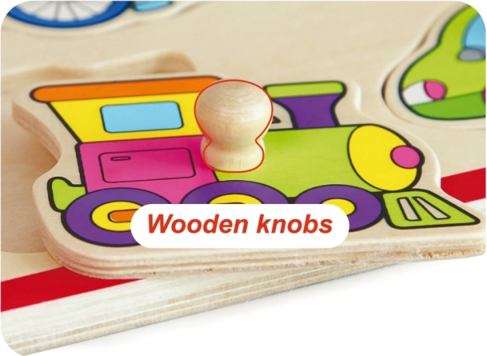 Elk puzzelstuk heeft een houten knopje, zodat kinderen het makkelijk kunnen optillen en precies op de juiste plek kunnen leggen – ideaal om de fijne motoriek te oefenen.