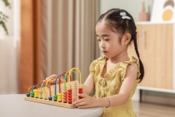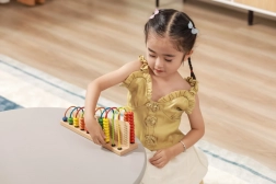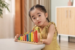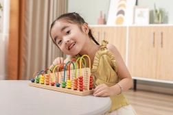 Op de basis zijn eenvoudige sommen afgedrukt. Het kind schuift de kralen en wijst het juiste aantal aan – een duidelijke en leuke manier om optellen en aftrekken te oefenen.