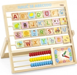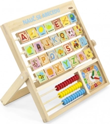 Houten alfabet en klok in het Tsjechisch. Kinderen kunnen letters en cijfers leren en een algemeen begrip van de klok ontwikkelen. Op de achterkant van elke letter staat een woord voor betere memorisatie. Afmetingen ca. 32,5 x 32 x 2,3 cm. Verpakkingsafmetingen ca. 34 x 32,5 x 3 cm. Leeftijd 3+