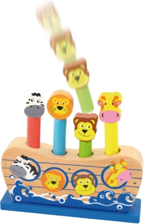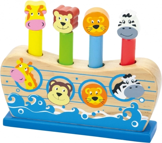 De stabiele houten basis in de vorm van een boot en vier houten stokjes met diertjes (giraffe, aapje, leeuw, zebra) creëren een veilige en duurzame speelomgeving. De fraaie verpakking maakt het een ideaal cadeau voor peuters en kleuters.