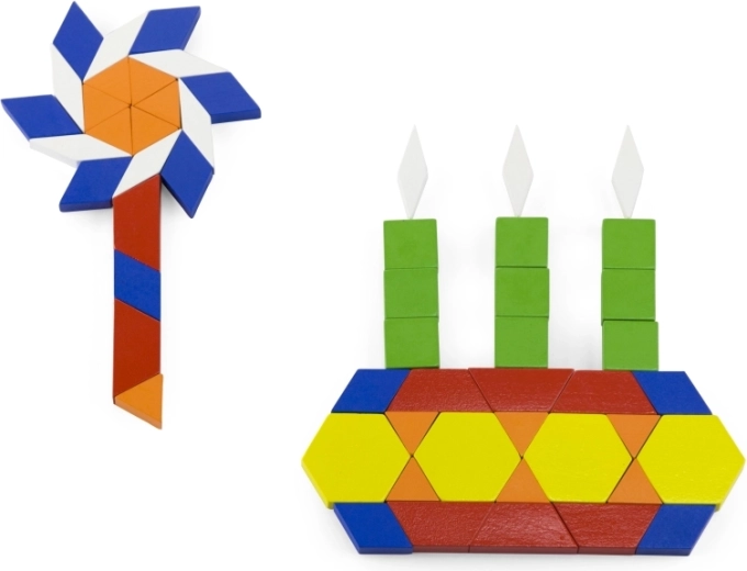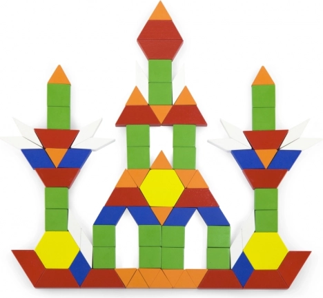 Het grote aantal platte houten blokken in diverse vormen en kleuren stimuleert de fantasie en de ontwikkeling van ruimtelijk inzicht. Kinderen kunnen patronen, dieren en complete afbeeldingen leggen.