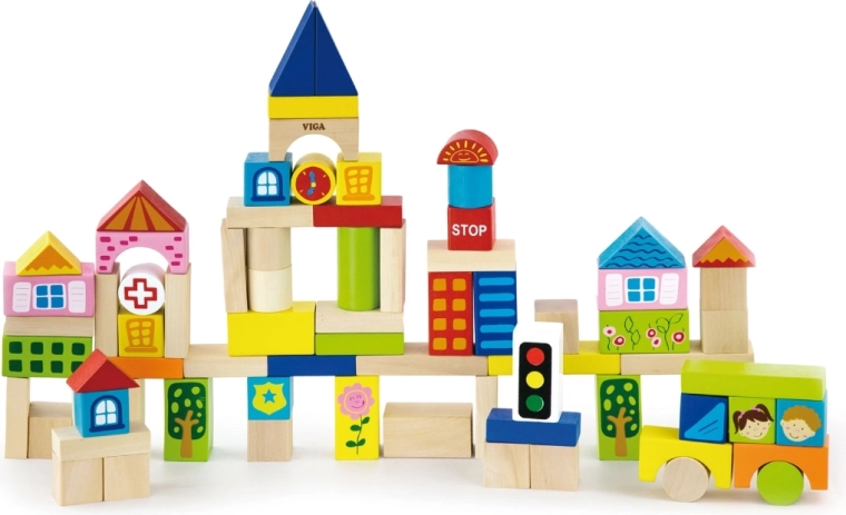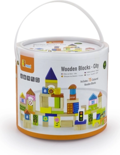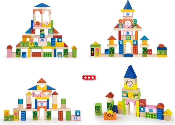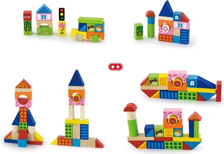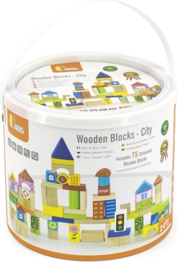 De set bevat blokken van verschillende afmetingen, van 2,5 cm tot 7,5 cm, waarmee kinderen verschillende bouwwerken zoals huizen, bruggen en andere stedelijke elementen kunnen maken. Dankzij het duurzame houten materiaal zijn de blokken geschikt voor langdurig en veilig spelen.