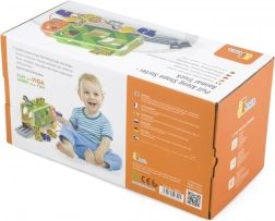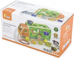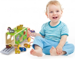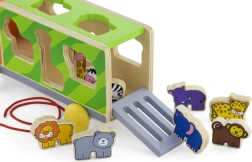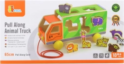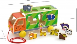 De vrachtwagen kan aan een touw worden voortgetrokken en dient tegelijk als slimme vormenstoof. Kinderen bewegen en gebruiken logisch denken bij het zoeken naar de juiste openingen voor de diertjes.