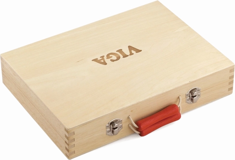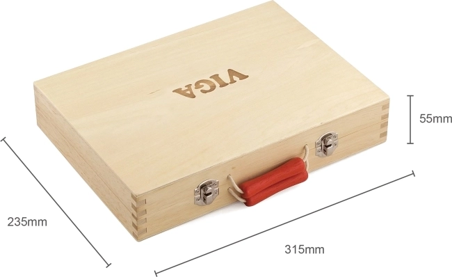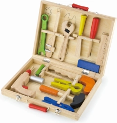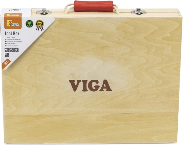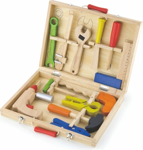 De stevige houten koffer met metalen sluitingen en rode handgreep houdt alles op zijn plaats, zodat er niets kwijtraakt. Dankzij de overzichtelijke indeling heeft ieder stuk gereedschap zijn eigen plek en is de hele set gemakkelijk mee te nemen op visite, op reis en naar de kinderkamer.
