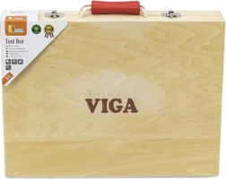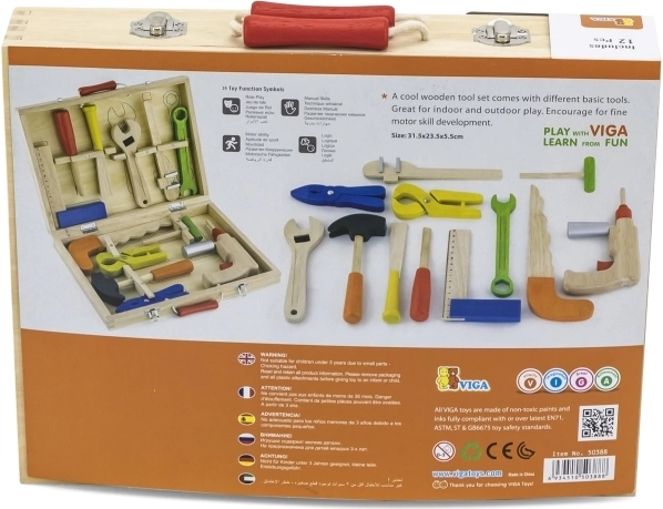 Deze hoogwaardige houten gereedschapsset van het merk VIGA biedt kinderen een realistische ervaring met gereedschap. Kleurrijke en duurzame onderdelen zoals een boormachine, hamer, schroevendraaier, sleutel en zaag prikkelen de verbeelding en bieden een veilige manier om vaardigheid en oog-handcoördinatie te ontwikkelen.