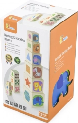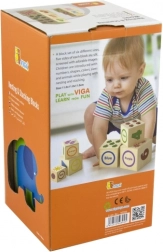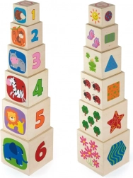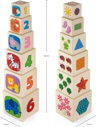 De set bevat 6 stevige houten kubussen in verschillende maten, waarmee kinderen een stabiele toren bouwen of ze in elkaar kunnen schuiven. Rijke illustraties met dieren, kleuren, vormen en hoeveelheden ondersteunen vroeg leren en vergroten de woordenschat.