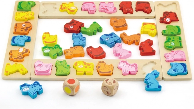Twee dobbelstenen (een met kleuren en een met dieren) bieden veel spelvarianten en ondersteunen het herkennen van kleuren en diermotieven.