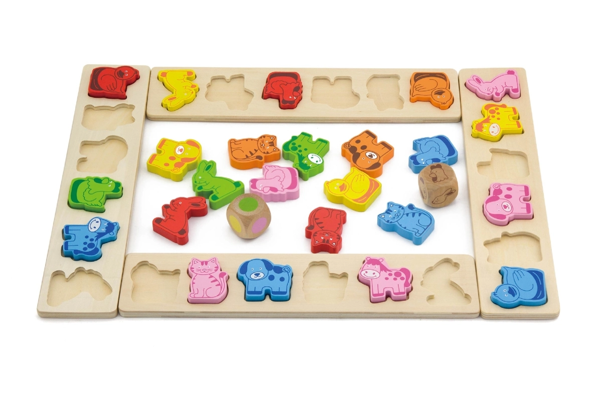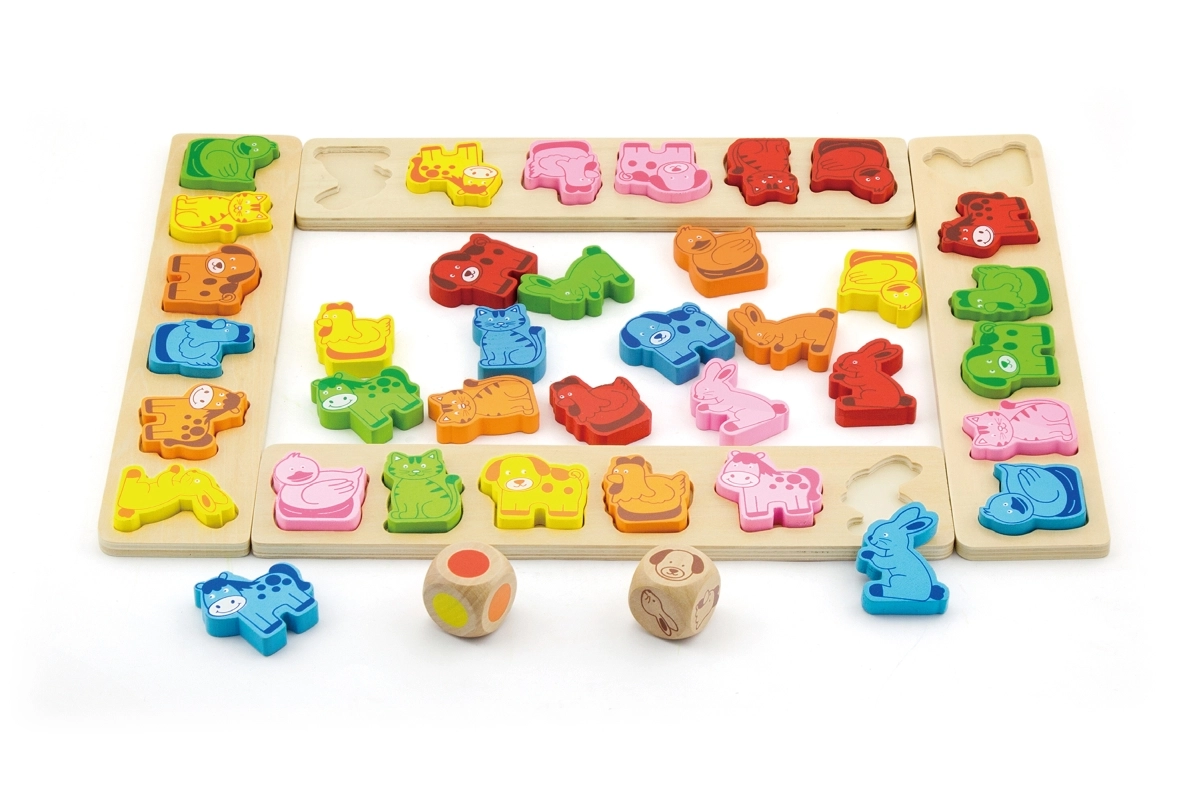 - 4 voorbeeldborden, 36 dierfiguren, 1 dierendobbelsteen, 1 kleurdobbelsteen