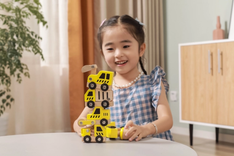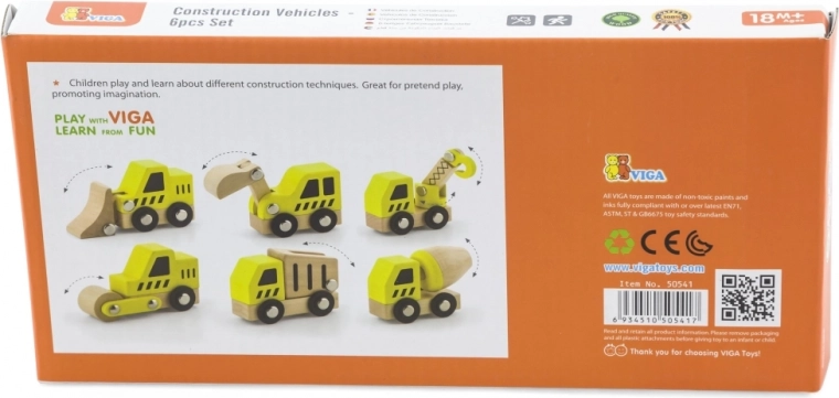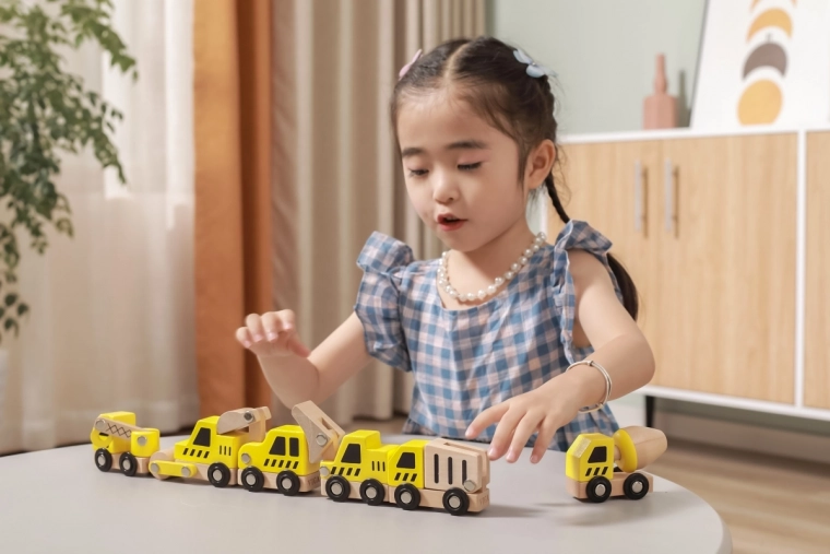 Elk voertuig heeft functionele wielen voor soepel rollen en sommige onderdelen suggereren beweegbare functies (bijv. bak, mixer of kraan), wat de natuurlijke nieuwsgierigheid en de ontwikkeling van de oog-handcoördinatie stimuleert.