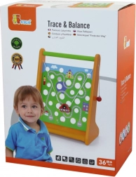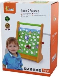 Beweeg het autootje met de knikker over de weg en ontwikkel de balansvaardigheid op twee touwtjes.
