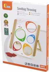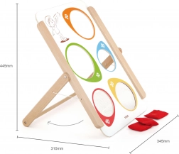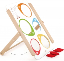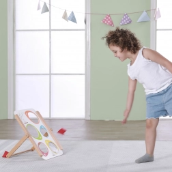 Het spel omvat een standaard met een houten frame en drie bonenzakjes, die makkelijk draagbaar zijn dankzij het inklapbare ontwerp.