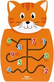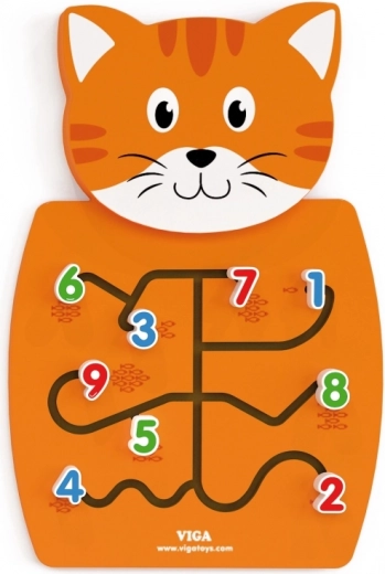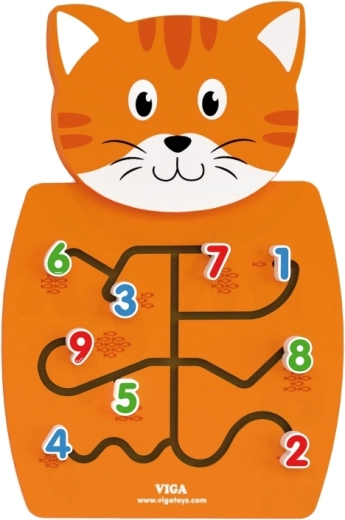 Houten kat met doolhoven om cijfers te verplaatsen en de fijne motoriek te ontwikkelen.