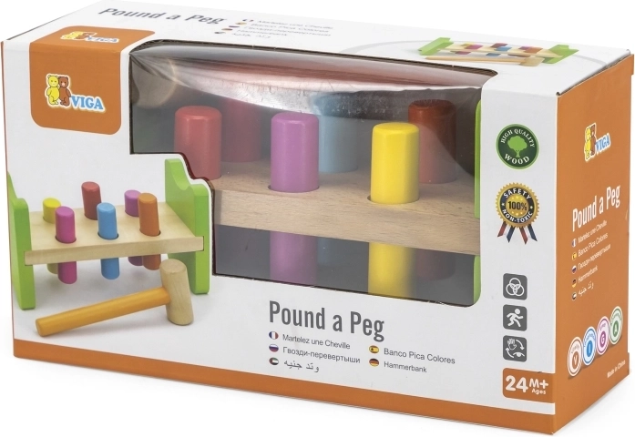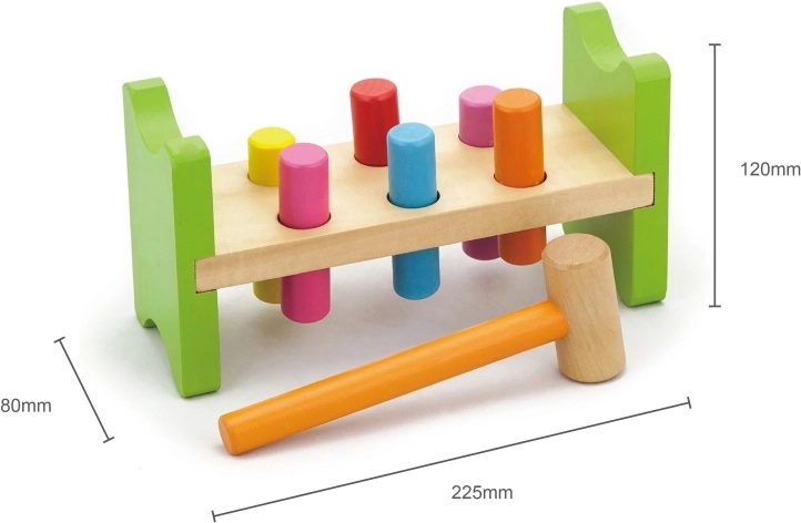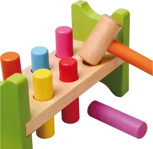 Inclusief houten hamertje en meerkleurige pinnetjes voor langdurig speelplezier.