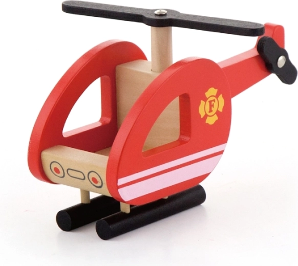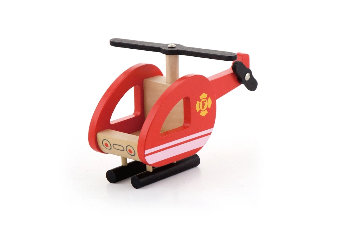 Compacte houten helikopter met draaibare rotor en stabiele skids die elke reddingsmissie vanuit de lucht compleet maakt.