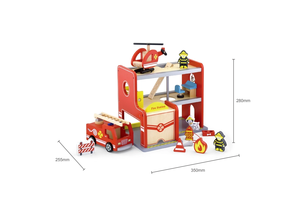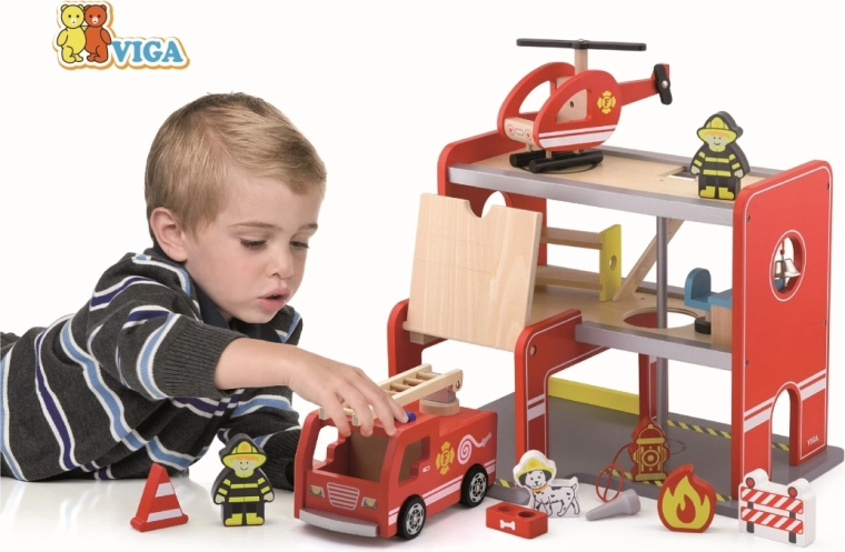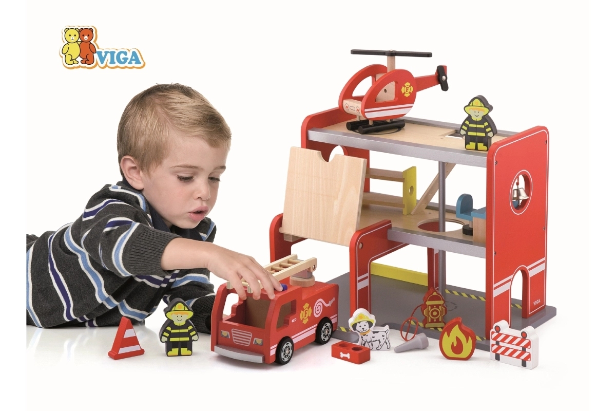 Het houten brandweerstation van Viga is een complete speelser met meerdere verdiepingen die rollenspel, de ontwikkeling van de fijne motoriek en de verbeelding stimuleert. Kinderen kunnen met de auto uit de garage rijden, met de helikopter op het bovenplatform landen en via de buis direct naar de inzetplaats glijden. Kleurrijke details en een hoogwaardige houten constructie zorgen voor een aantrekkelijke look en duurzaamheid bij dagelijks gebruik.