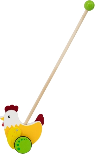 Deze duwer met kip ondersteunt kinderen bij de ontwikkeling van hun loopbeweging en coördinatie.
