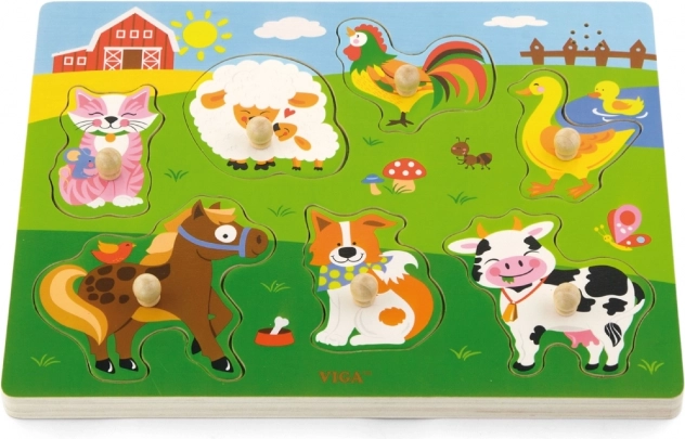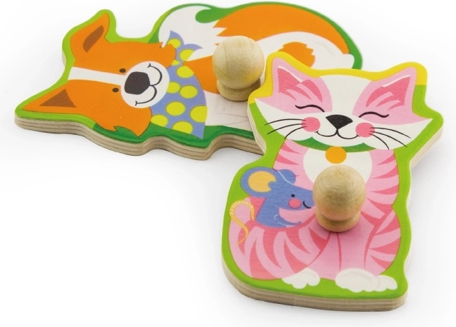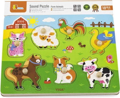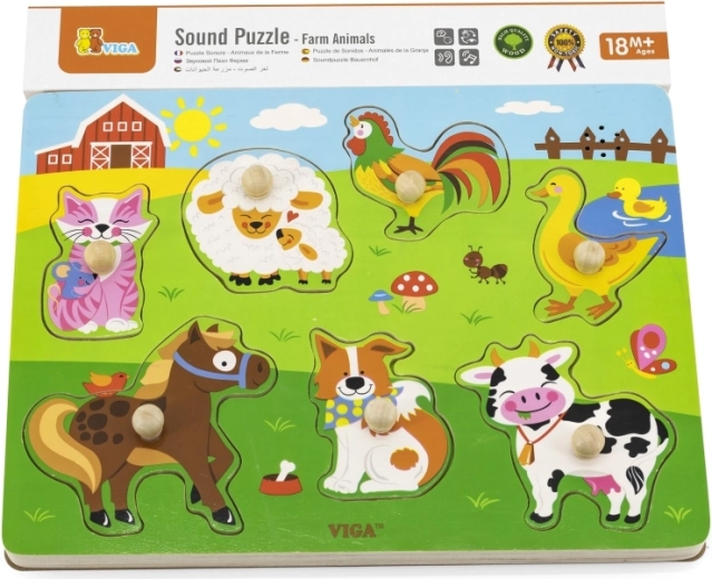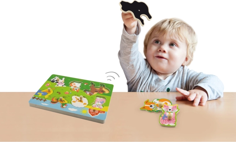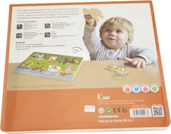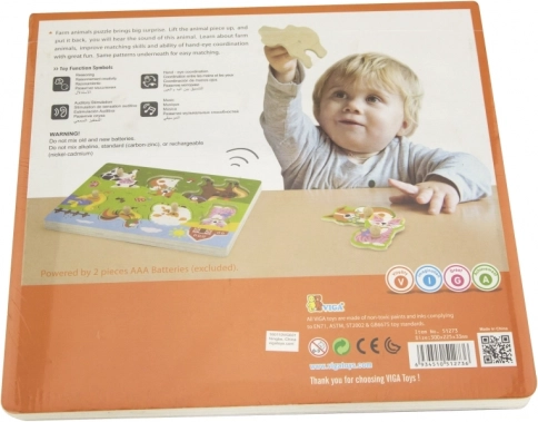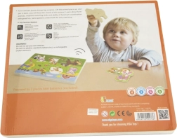 Houten dieren-inlegpuzzel met geluid. Wanneer het juiste dier wordt geplaatst, klinkt het geluid dat het dier maakt. Afmetingen bord ca. 30 x 22,5 x 2 cm. Voeding: 2 x AAA-batterijen (niet inbegrepen). Afmetingen verpakking ca. 30 x 27 x 2 cm. Leeftijd 18 mnd+