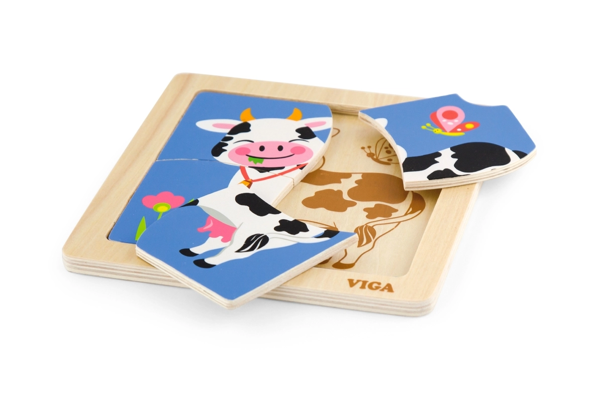De houten koeienpuzzel van Viga biedt jonge kinderen een geweldige manier om vormen te leren herkennen en de fijne motoriek te ontwikkelen. De set bevat 4 puzzelstukjes en een afbeelding die het kind helpt bij het leggen. De puzzel is zorgvuldig vervaardigd uit veilige houten materialen en beschilderd met levendige, niet-giftige verven. Elk spelmoment met deze puzzel zit vol plezier en ontwikkeling voor je kind.