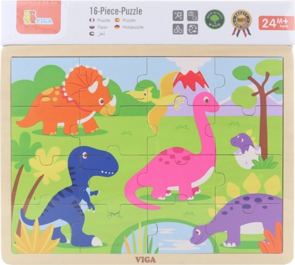 Ontdek de kwalitatieve VIGA houten dinosauruspuzzel die kinderen hun eerste plezier in puzzelen biedt. 16 stukjes trainen de fijne motoriek, oog-handcoördinatie en logisch denken. Je kunt de stukjes leggen op de houten plaat met kader of de afbeelding maken zonder kader. Het formaat van de gelegde puzzel is ca. 27,5 × 20 cm, geschikt vanaf 24 maanden.