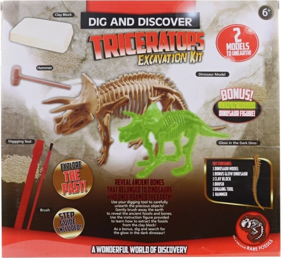 - Uitbeitelblok, hamertje, kwastje, beitel, triceratops-skelet (10 delen), figuur dat in het donker licht