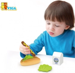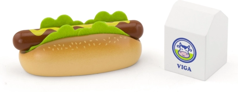 Deze hoogwaardige houten set van VIGA biedt kinderen realistisch kookspel. De hotdog met broodje, sla en mosterd samen met het “melkpak” stimuleren creativiteit en leren kinderen de basis van sociaal spel. Dankzij de stevige houten afwerking is de set ideaal voor dagelijks spelen.