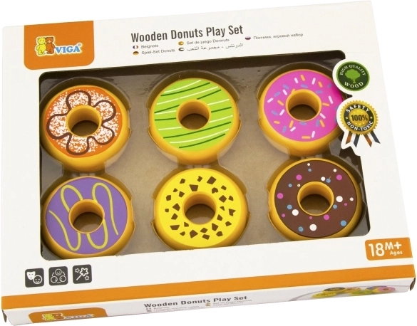 Speelse set van zes houten donuts voor kinderen vanaf 18 maanden, stimuleert fijne motoriek, fantasie en rollenspellen zoals winkel of café. Elke donut heeft een andere kleurrijke decoratie en een aangenaam glad oppervlak voor veilig hanteren.