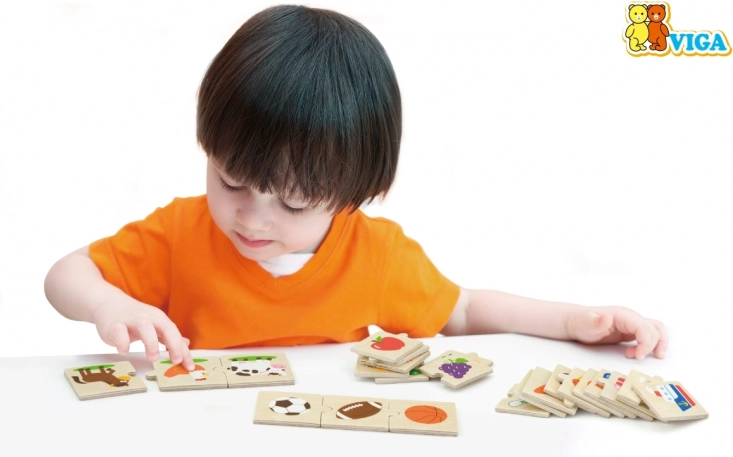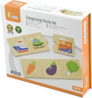 De houten logische puzzels van VIGA combineren plezier met leren. Kinderen verbinden 24 stukjes tot 8 betekenisvolle drieluiken – bijvoorbeeld drie dieren, drie vervoermiddelen of drie soorten groenten. Zo oefenen ze op een natuurlijke manier het herkennen van categorieën, concentratie en woordenschat.