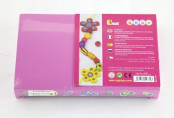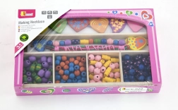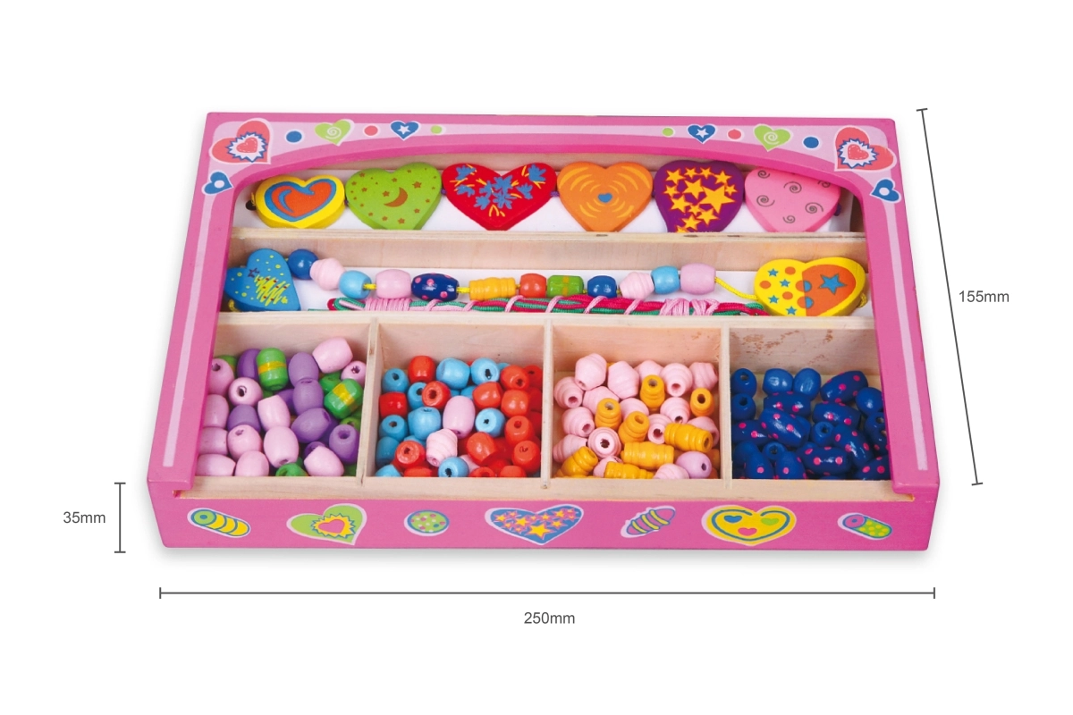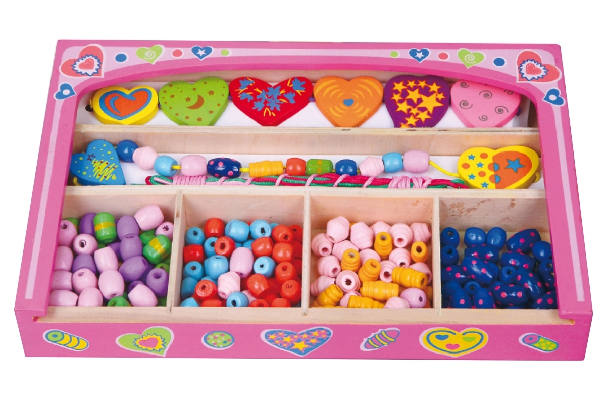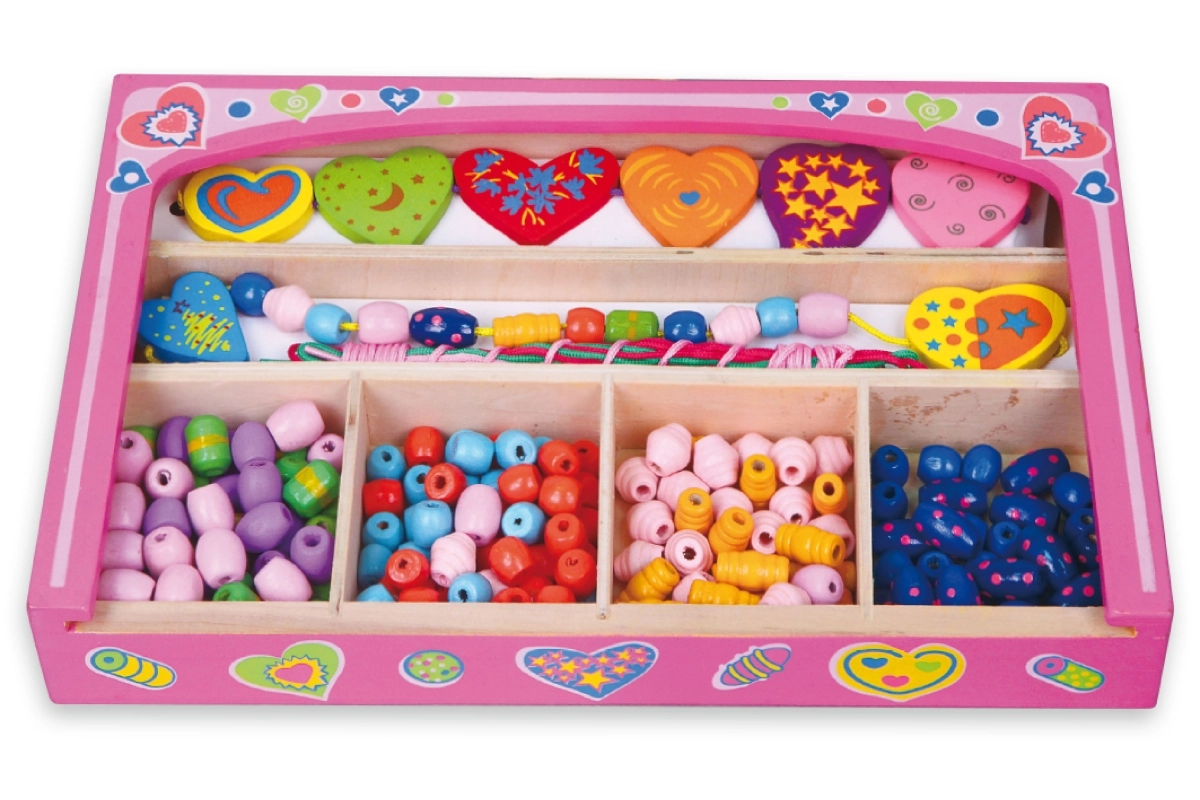 Ontdek de magie van knutselen met deze houten kralenset, boordevol kleuren, vormen en maten. Dankzij de overzichtelijke houten doos met vakjes hebben kinderen alles bij de hand en maken ze eenvoudig originele sieraden – van armbanden tot kettingen.