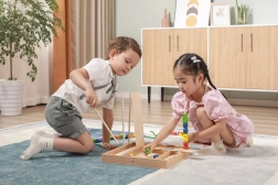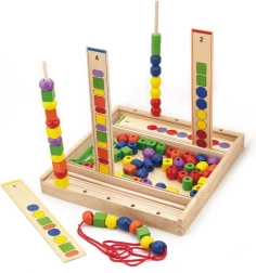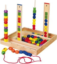 Kinderen stapelen en rijgen kralen op stokjes in de volgorde die door de kaarten wordt aangegeven. Ze oefenen oog–handcoördinatie, geduld en het herkennen van kleuren en vormen.