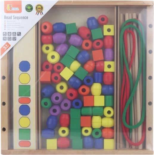 Binnenin vind je een ruime uitrusting voor creatief rijgen en ordenen volgens voorbeelden – overzichtelijk opgeborgen in een kist van natuurlijk hout met deksel voor eenvoudig opbergen.