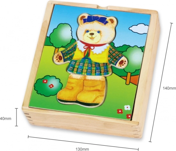 Een schattige houten puzzelset van het merk Viga waarmee kinderen zes verschillende afbeeldingen van een berenmeisje kunnen samenstellen, in diverse stemmingen en outfits. Ondersteunt fijne motoriek, logisch denken en emotieherkenning, terwijl het praktische doosje alle stukjes netjes bij elkaar houdt.