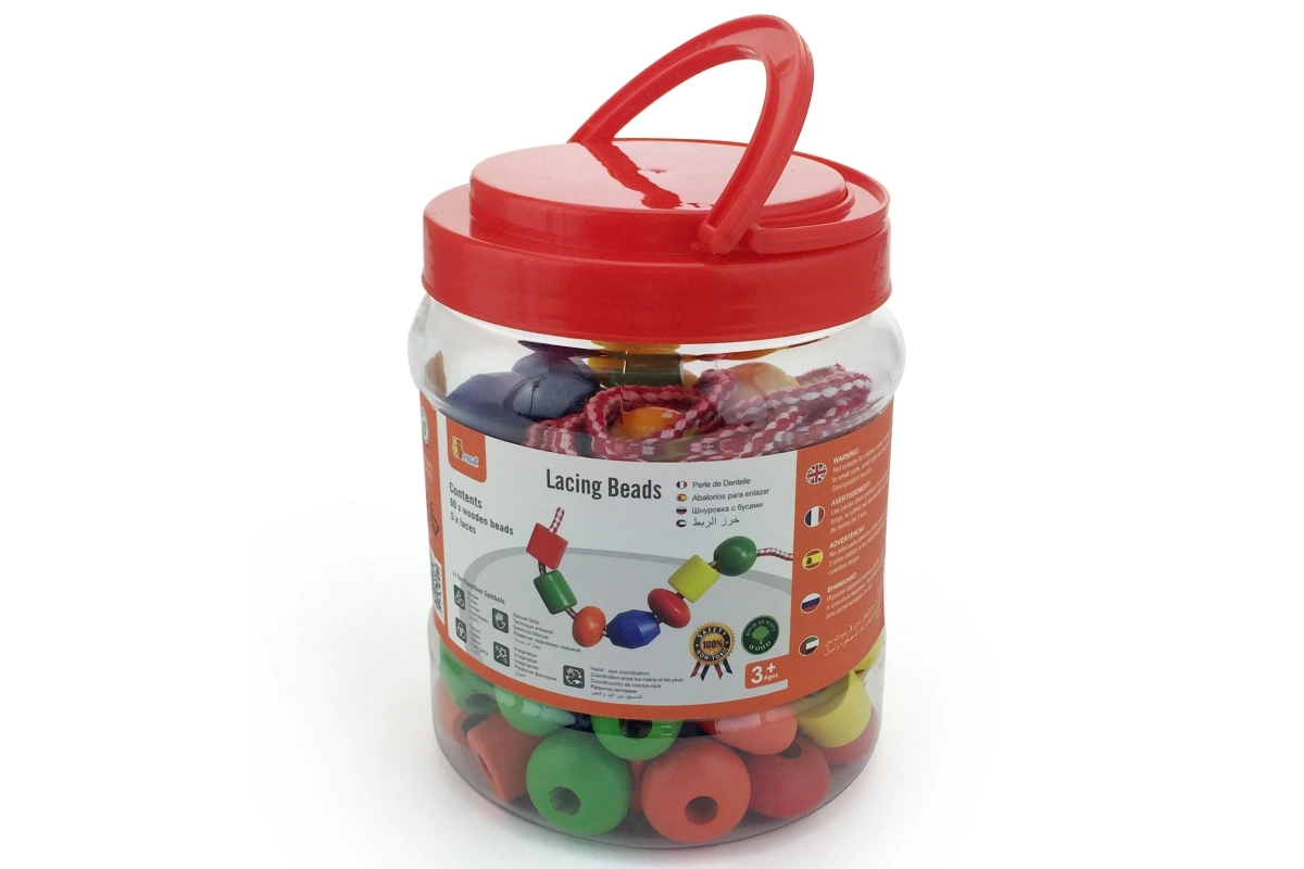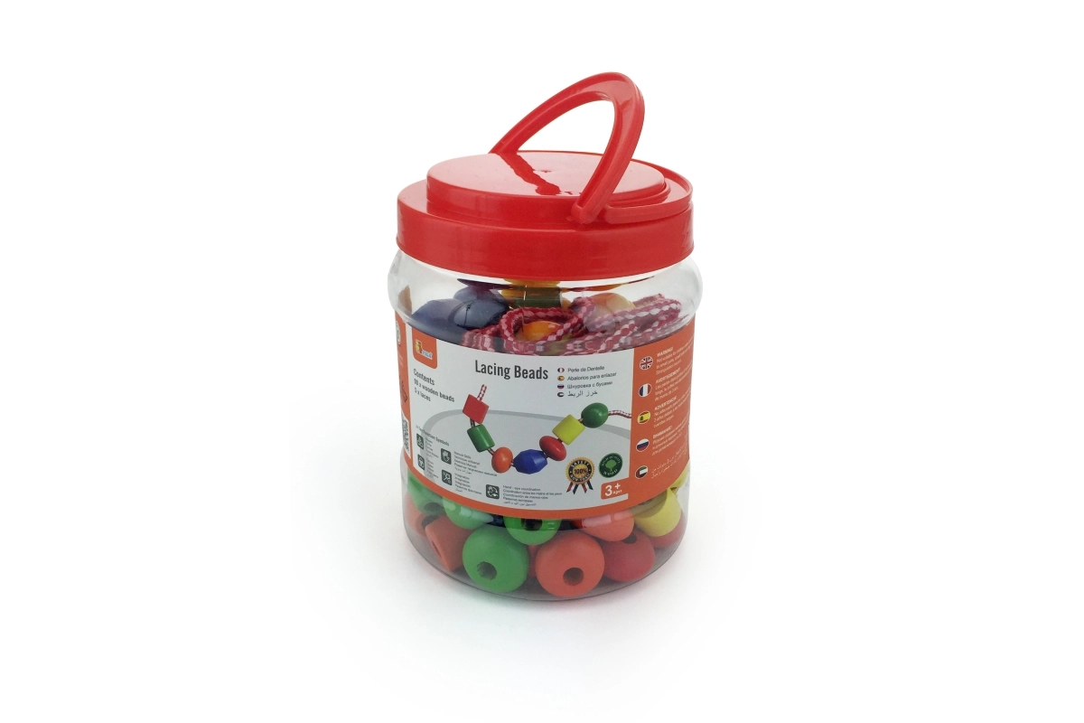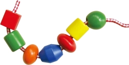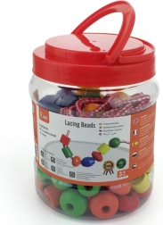 De plastic doos bevat grote houten kralen en gekleurde veters waarop de kralen geregen kunnen worden. Afmeting van de kraal ca. 2 x 2 cm, afhankelijk van het type. Afmetingen van de verpakking ca. 16 x 12 cm. Bevat 90 kralen en 5 koorden. Leeftijd 3+.