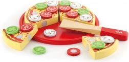 De pizza is verdeeld in punten en wordt geleverd met een spateltje/mesje, zodat kinderen kunnen snijden en serveren zoals in een echte pizzeria.